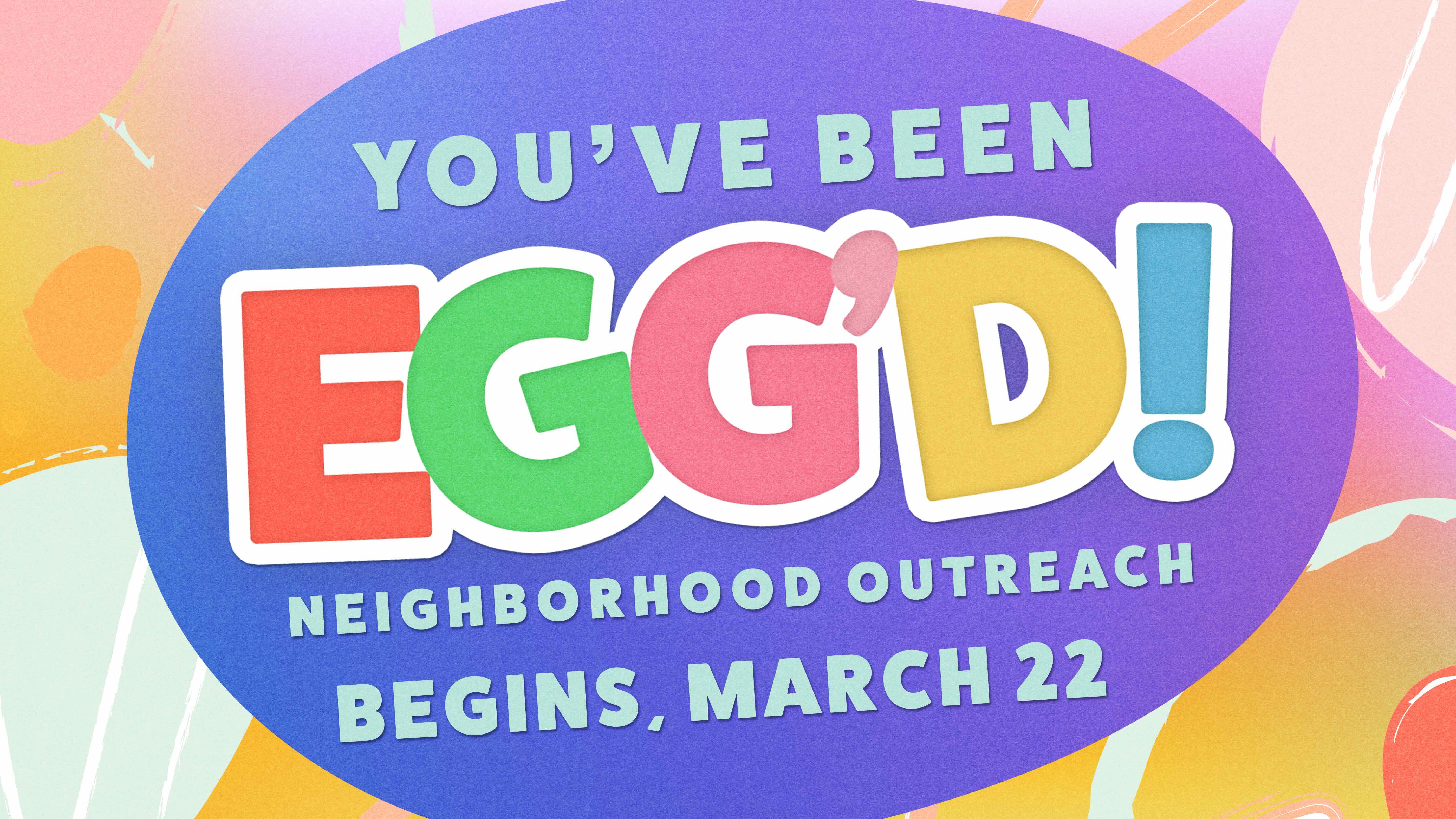 Consider joining us for our "You've been Egg'd" community outreach this Easter! Baskets filled with easter eggs will be available in the church lobby beginning March 22nd. Take a basket and an Easter invitation to place around your friends' or neighbors' yard for their children to enjoy.