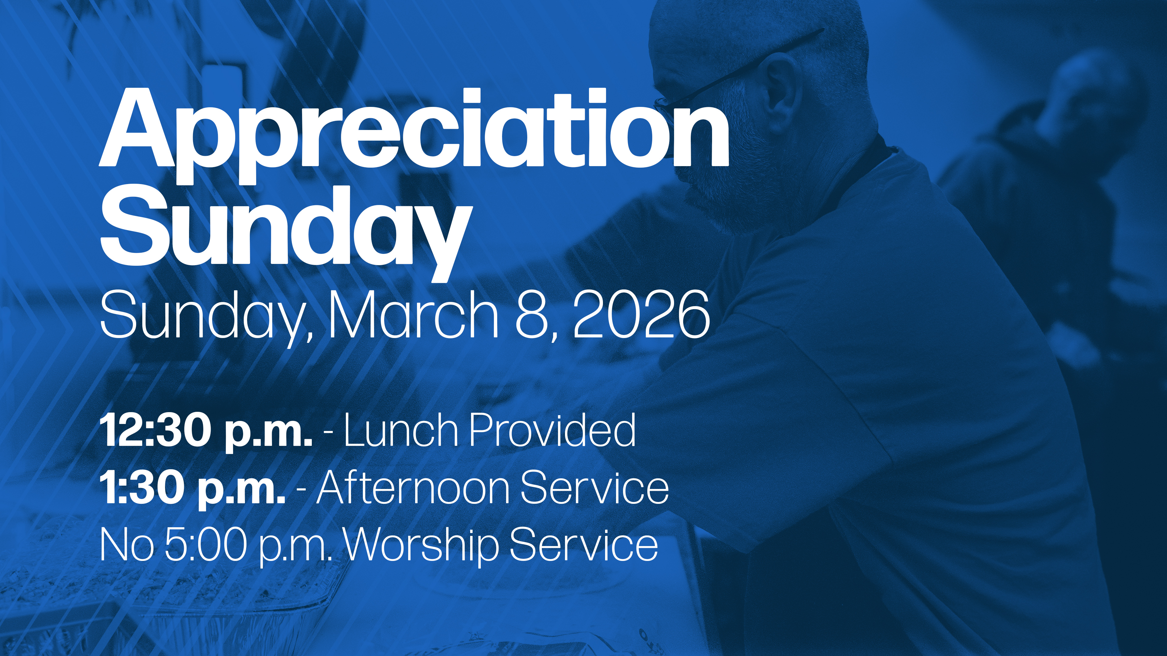 All are welcome for an appreciation lunch at 12:30pm in the Activity Center, followed by an Afternoon Service. There will be no 5:00 p.m. Evening Service.