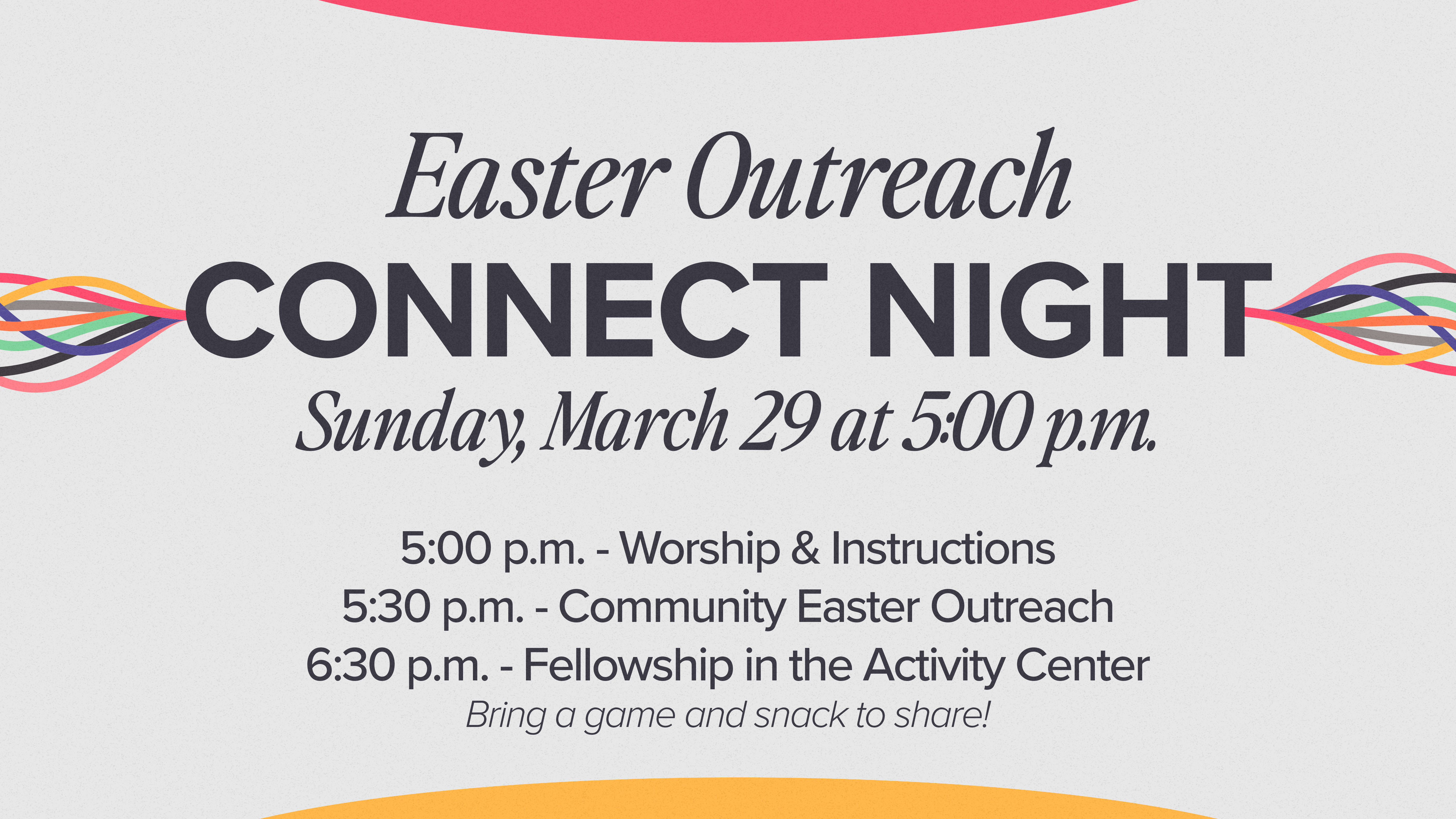 On the 5th Sunday of select months, we’ll use our evening service time for connection opportunities. Our first Connect Sunday is Easter Outreach, happening Sunday, March 29 at 5:00 p.m., and following the outreach we’ll gather for a fellowship time in the Activity Center.