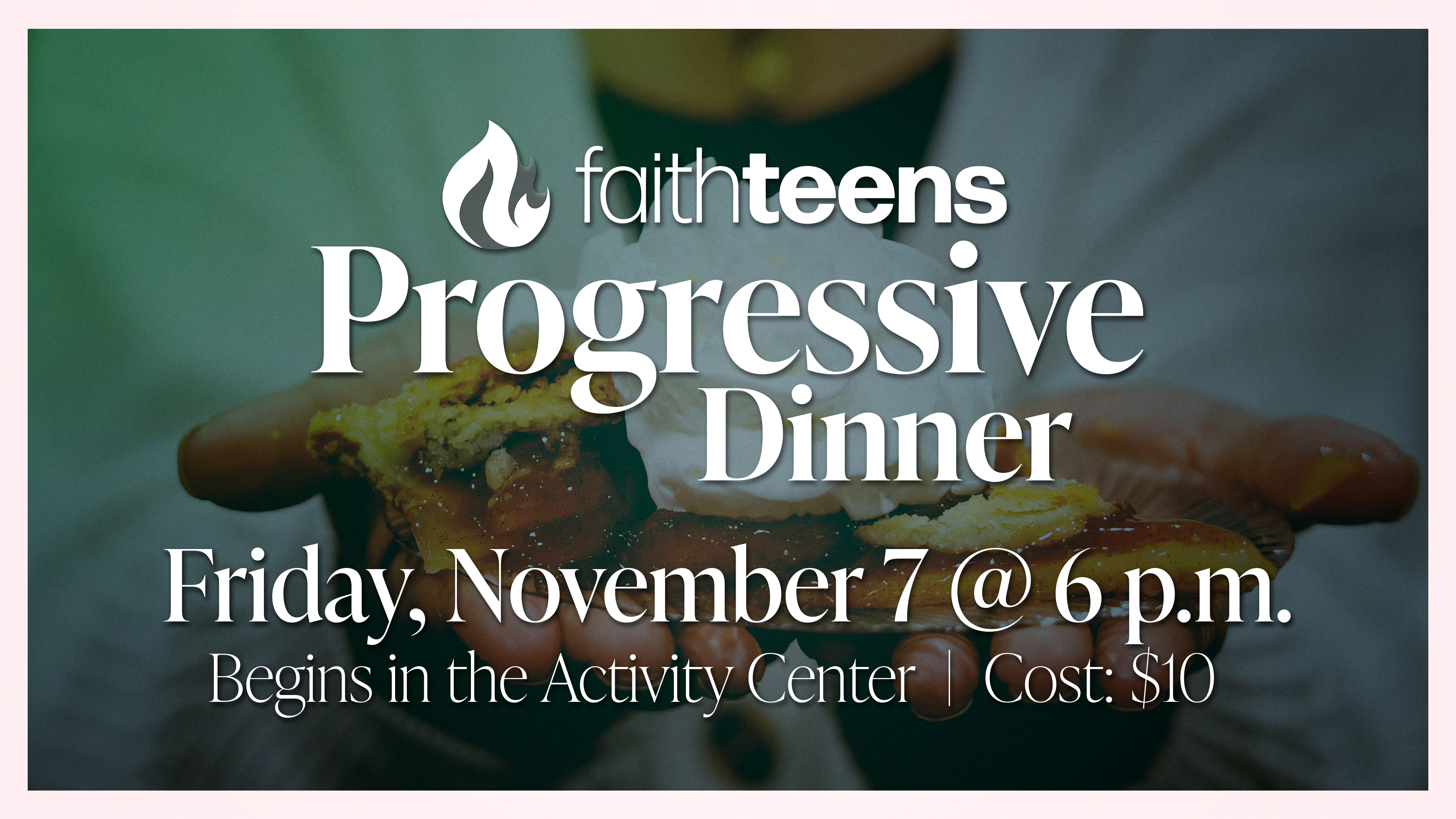 All 7th-12th graders are invited to join us for a great night at the Progressive Dinner. We will meet in the Activity Center at 6 pm and arrive back at the church for a bonfire. Pick up is at 8:30 pm.